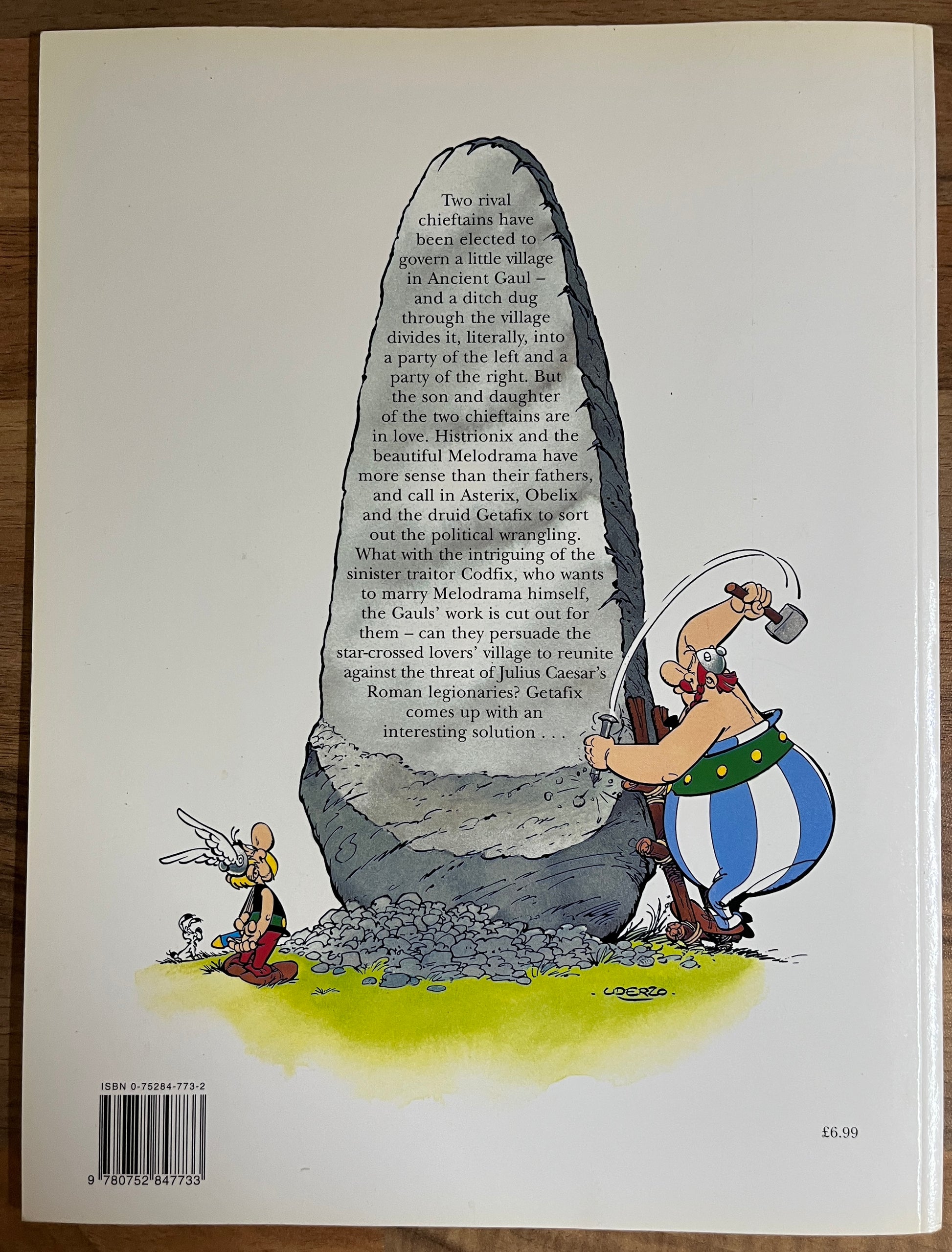 Two rival chieftains have been elected to govern a little village in ancient Gaul - and a ditch dug through the village divides it, literally, into a party of the left and a party of the right. But the son and daughter of the two chieftains are in love. Histrionix and the beautiful Melodrama have more sense than their fathers, and call in Asterix, Obelix and the druid Getafix to sort out the political wrangling. What with the intriguing of the sinister traitor Codfix, who wants to marry Melodrama himself, the Gauls' work is cut out for them - can they persuade the star-crossed lovers' village to reunite against the threat of Julius Caesar's Roman legionaries Getafix brews some interesting new magic potions to help...