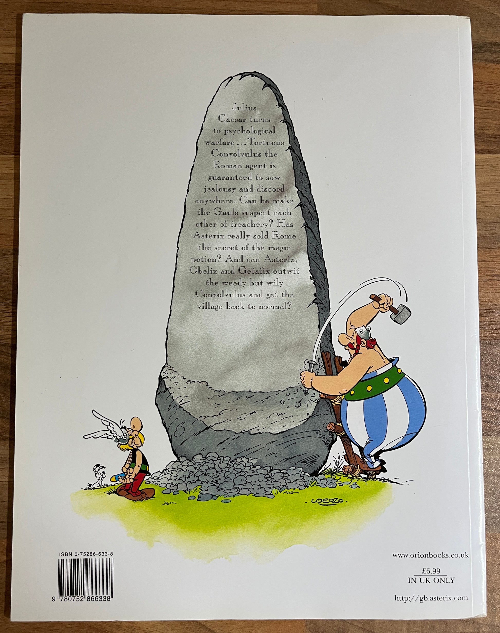 Julius Caesar tries psychological warfare to defeat the little Gaulish village and sends expert troublemaker Tortuous Convolvulus to set friend against friend and almost succeeds: see jealousy spread as the Gauls become suspicious of each other! Can Asterix and Obelix, with the expert aid of the druid Getafix, outwit the weedy but wily Convolvulus and get the village back to normal.