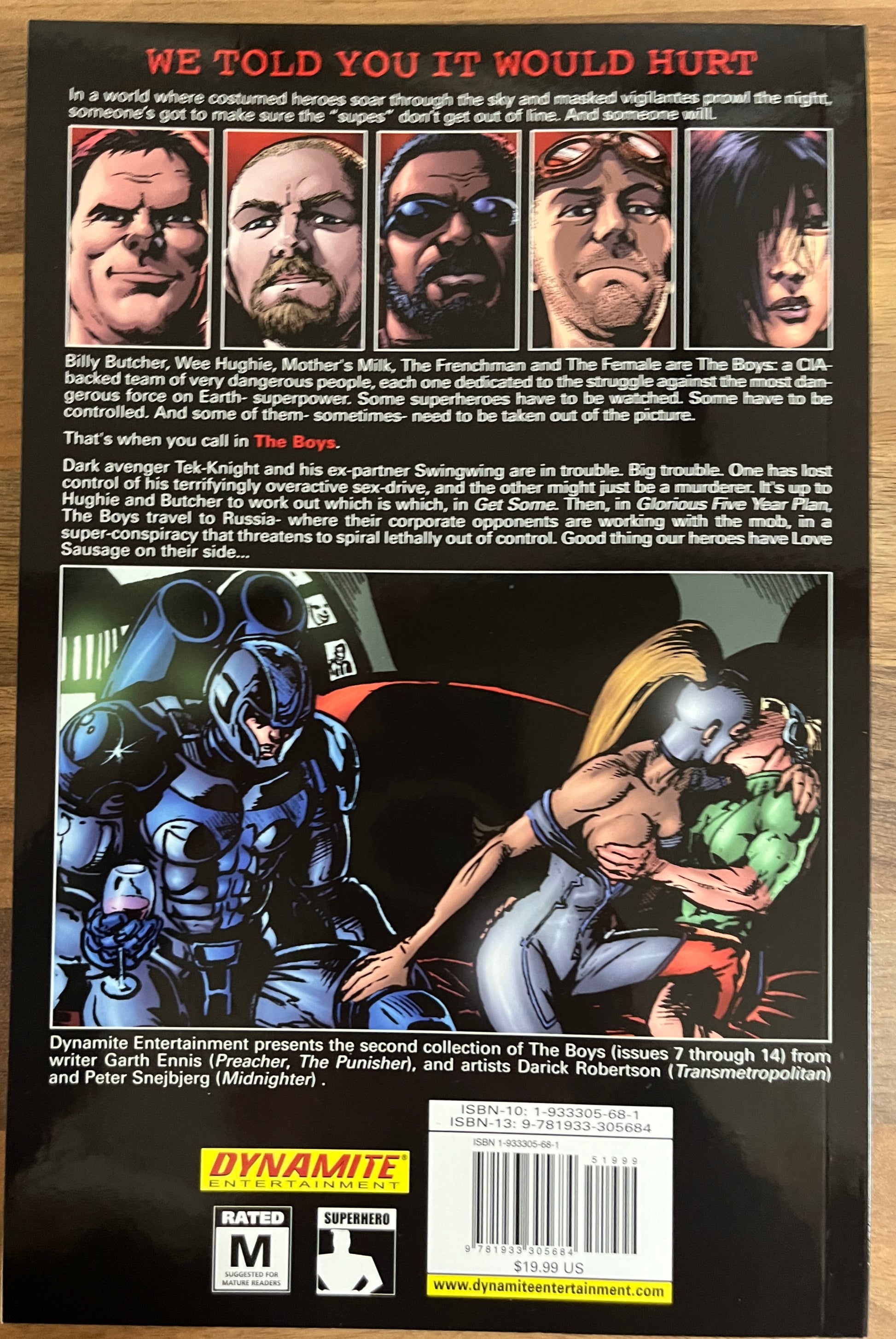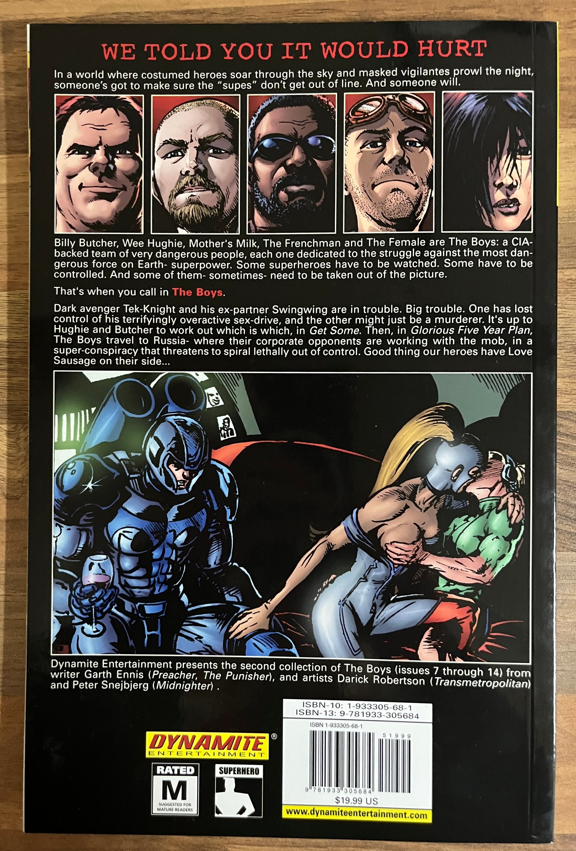 The second volume of the acclaimed series The Boys is here by Garth Ennis and Darick Robertson! Dark avenger Tek-Knight and his ex-partner Swingwing are in trouble. Big trouble. One has lost control of his terrifyingly overactive sex-drive, and the other might just be a murderer. It's up to Hughie and Butcher to work out which is which, in Get Some. Then, in Glorious Five Year Plan, The Boys travel to Russia - where their corporate opponents are working with the mob, in a super-conspiracy that threatens to spiral lethally out of control. Good thing our heroes have Love Sausage on their side. The Boys, Vol. 2: Get Some collects issues 7-14 of the critically acclaimed series and is an excellent companion to Dynamite's best-selling Volume I Paperback "The Name of the Game!