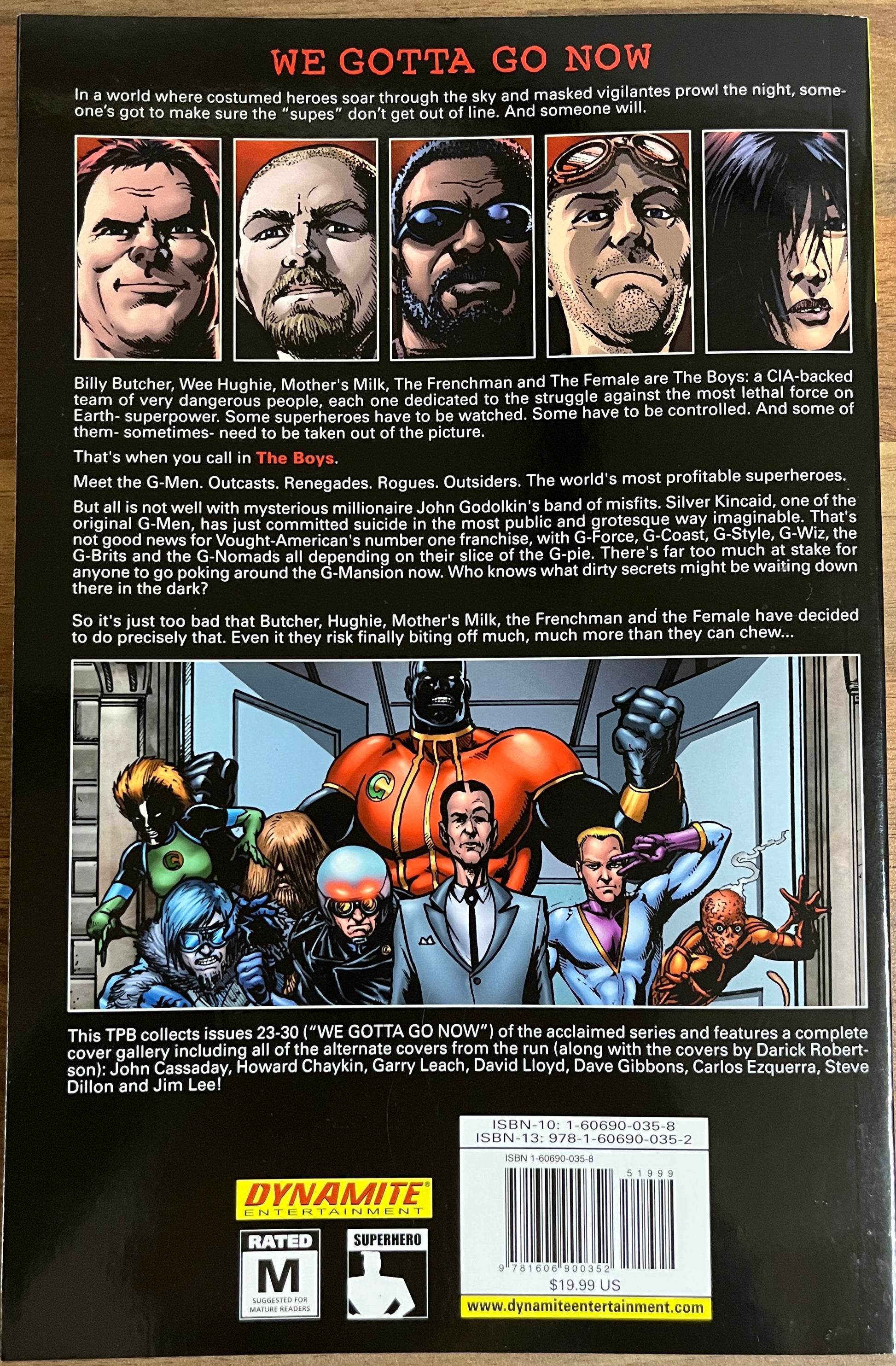 The fourth Dynamite collection of Garth Ennis and Darick Robertson's The Boys is here! All is not well with mysterious millionaire John Godolkin's band of misfits. Silver Kincaid, one of the original G-Men, has just committed suicide in the most public and grotesque way imaginable. That's not good news for Vought-American's number one franchise, with G-Force, G-Coast, G-Style, G-Wiz, the G-Brits and the G-Nomads all depending on their slice of the G-pie. There's far too much at stake for anyone to go poking around the G-Mansion now. Who knows what dirty secrets might be waiting down there in the dark? So it's just too bad that Butcher, Hughie, Mother's Milk, the Frenchman and the Female have decided to do precisely that. Even if they risk finally biting off much, much more than they can chew. The Boys, Vol. 4: We Gotta Go Now collects issues 23-30 of the acclaimed series and features a complete cover gallery including all of the alternate covers from the run (along with the covers by Darick Robertson, John Cassaday, Howard Chaykin, Garry Leach, David Lloyd, Dave Gibbons, Carlos Ezquerra, Steve Dillon and Jim Lee!