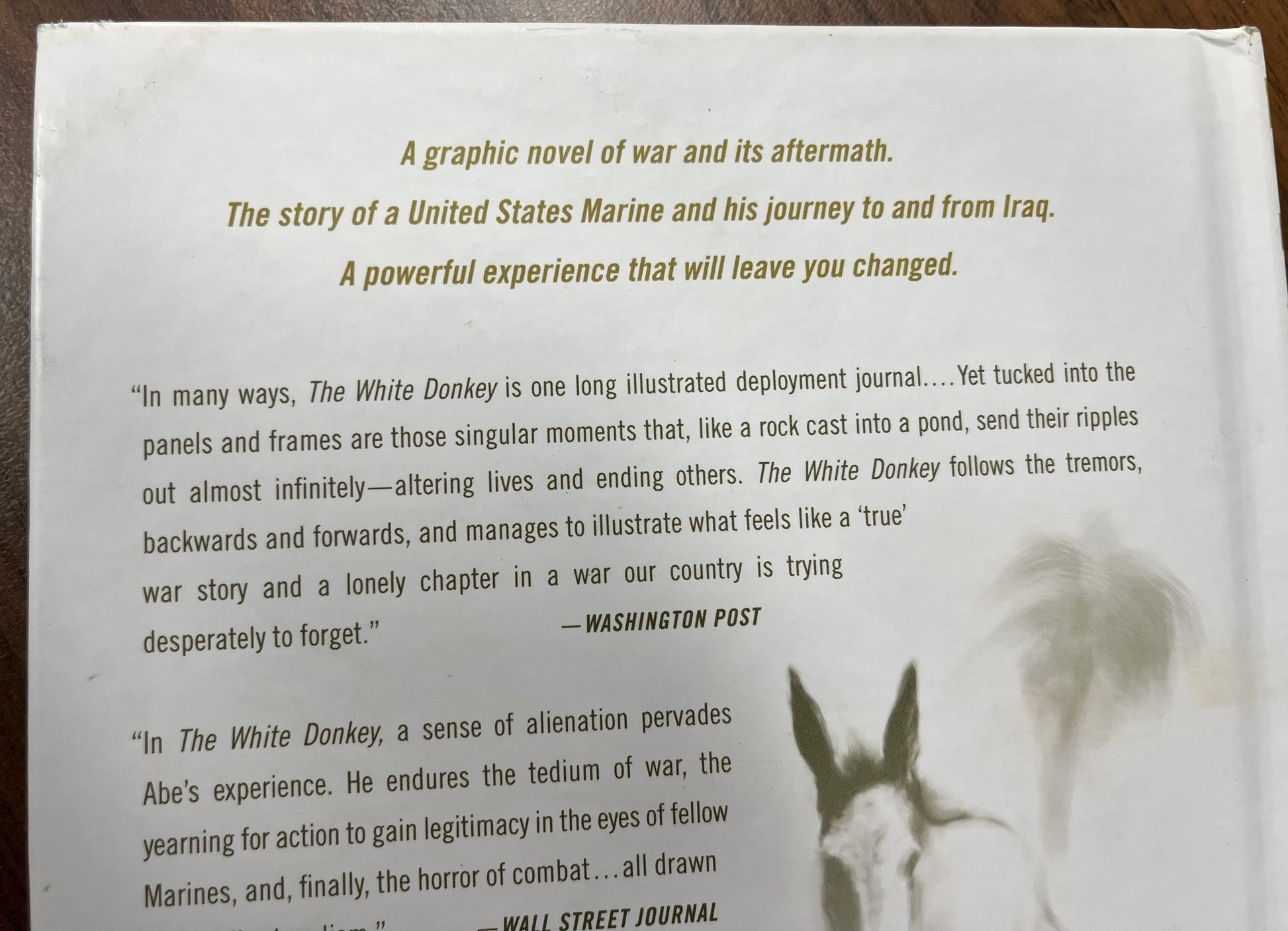 Abe gets more than he bargained for when his journey takes him to the middle east in war-torn Iraq. This is a story about a Marine, written and illustrated by a Marine, and is the first graphic novel about the war in Iraq from a veteran. The White Donkey explores the experience of being a Marine, as well as the challenges that veterans face upon their return home, and its raw power will leave you in awe.